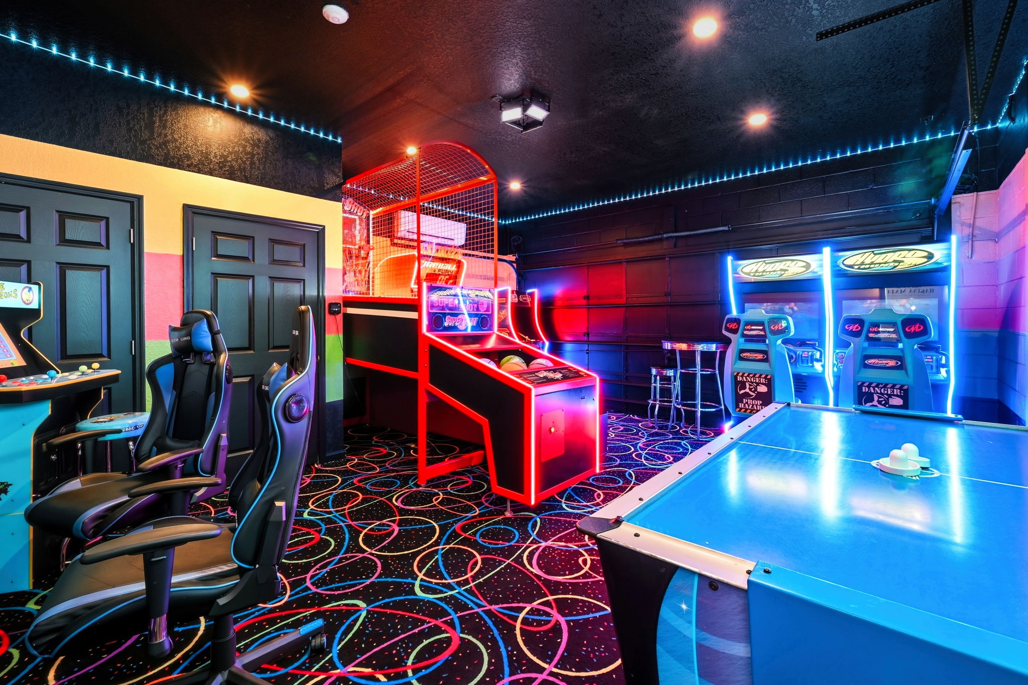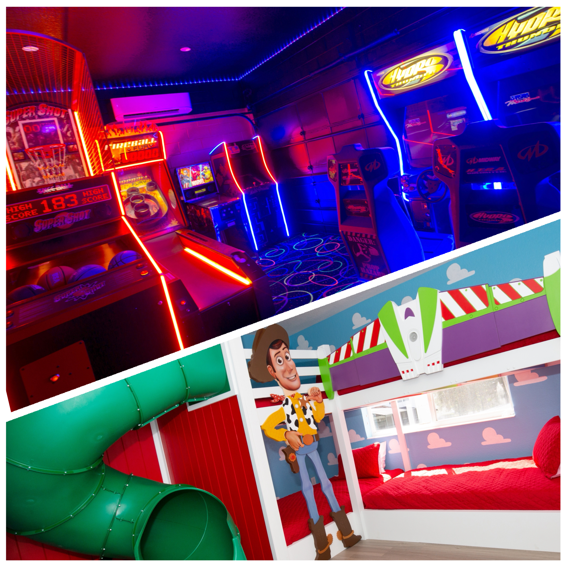 The Marvel themed game room has it all! The Multicade offers 60 arcade classics such as Mrs. Pac-Man, Galaga, and Donkey Kong for fun for the whole family. Looking for something modern? We’ve got an next generation XBOX Series X and a PlayStation 4 hooked up to a 55” TV with 2x gaming chairs! Bring your own games discs to use or log in with your personal account to download games and play online. Try your hand at our 2x sit-down racers, Hydro Thunder which offer head-to-head arcade action for 2 players! We also have a commercial grade air hockey and foosball table, 4-player Simpsons the Arcade game and digital Marvel pinball (10 Games)! You won’t want to leave!