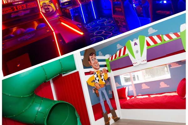 Four twin beds and a TUBE SLIDE in our custom made Toy Story bedroom